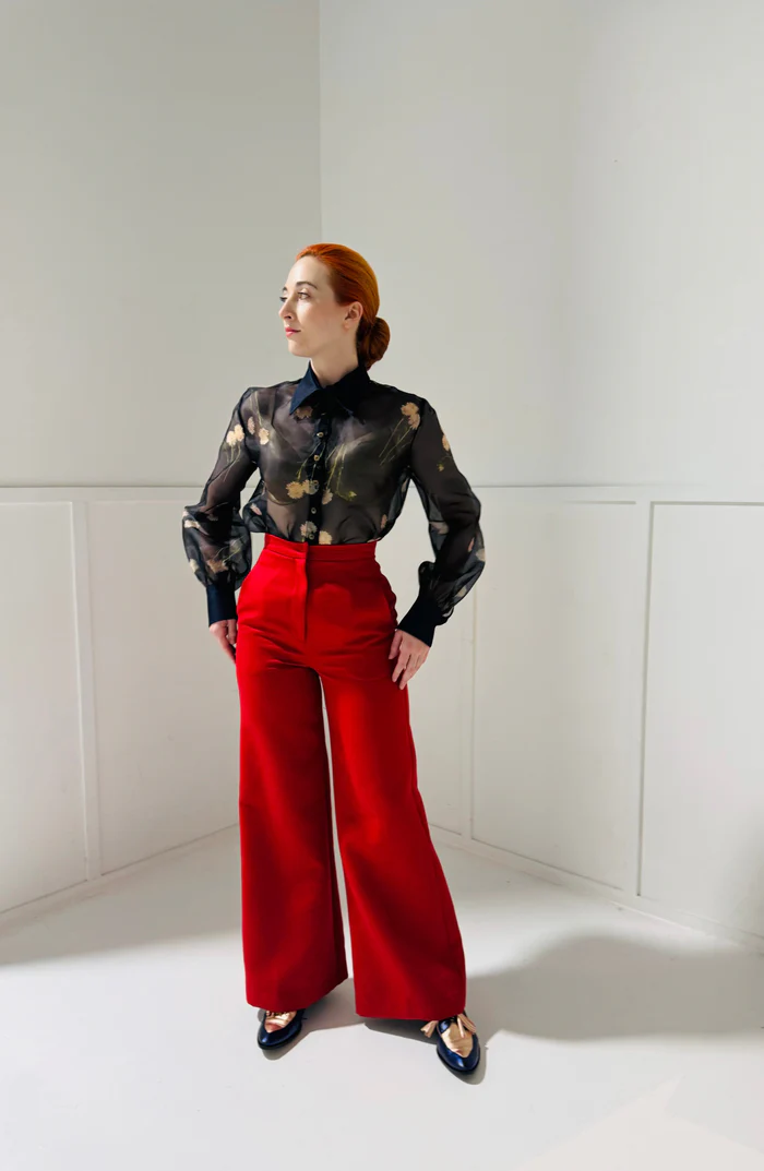 This Anthony in navy floral print is made in a beautiful silk organza . Classic collar, similar to Geo shirt, with the back pleat and with classic cuffs, slight bell sleeve.