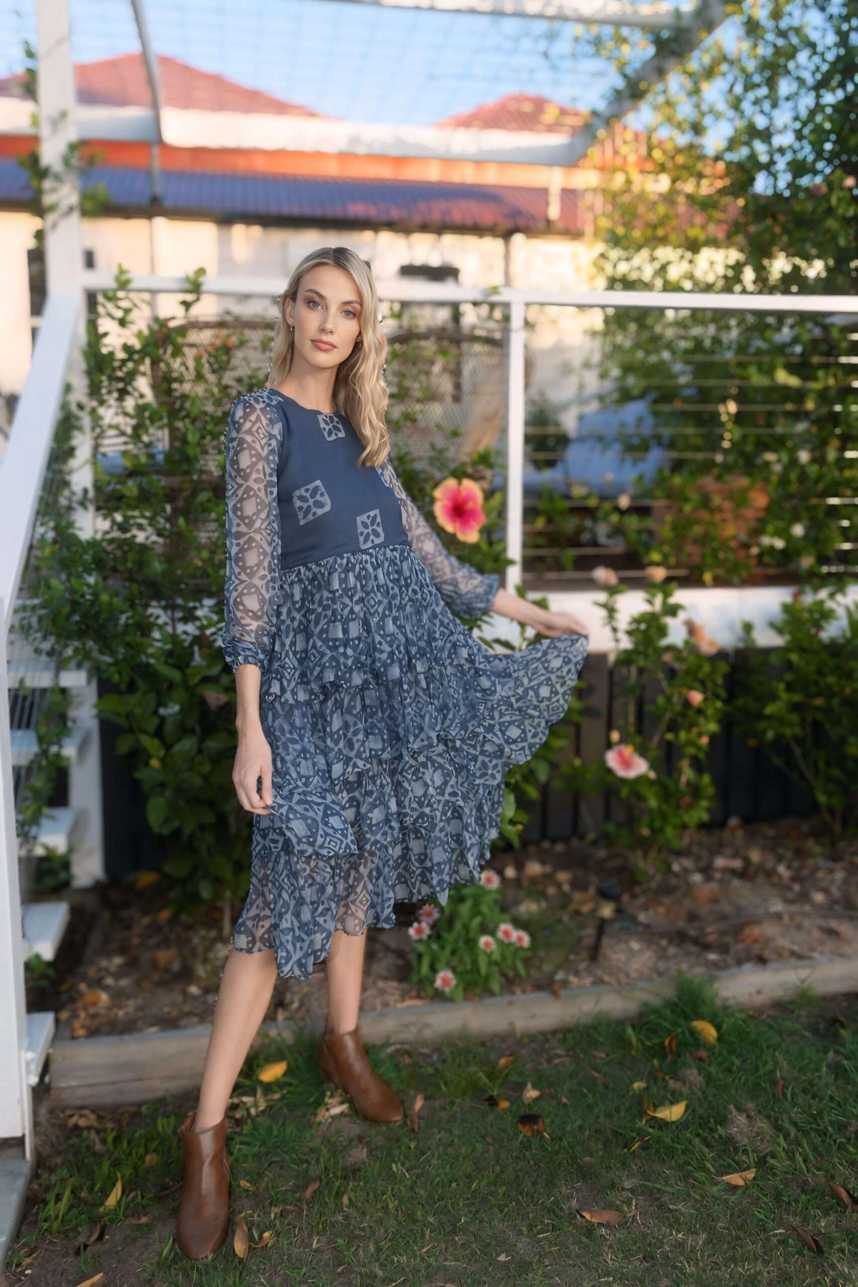 This Bluebell Tiered Midi Dress comes with a matching scarf and scrunchie made from offcuts to embody our zero waste ethos. Made from 100% Georgette Silk, this stunning dress is hand-dyed and printed to perfection, celebrating the art and beauty of slow fashion. It’s tiered design and intricate patterns capture the essence of vintage, bringing to mind serene moments spent in fields of wildflowers.