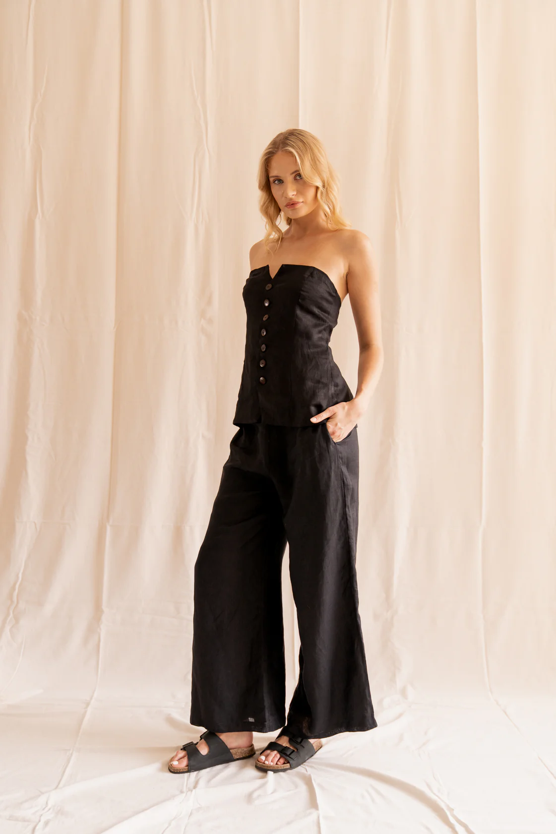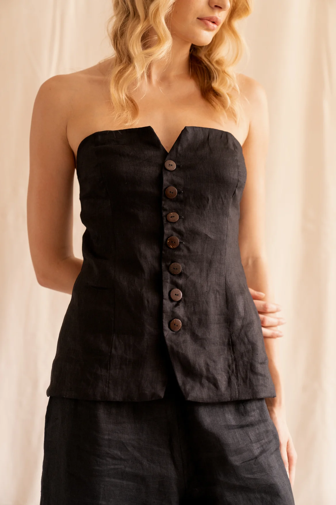 Elevating suiting in contemporary style, Cartia is a Longline Strapless Top adorned with accented front buttoning that finishes just before a front split detail, for maximum breathability in movement. The lined linen-make creates a hugged silhouette that accents your body lines while maintaining a structured look. Pair with our Florence pants for poised look, suitable for work attire and social outings.