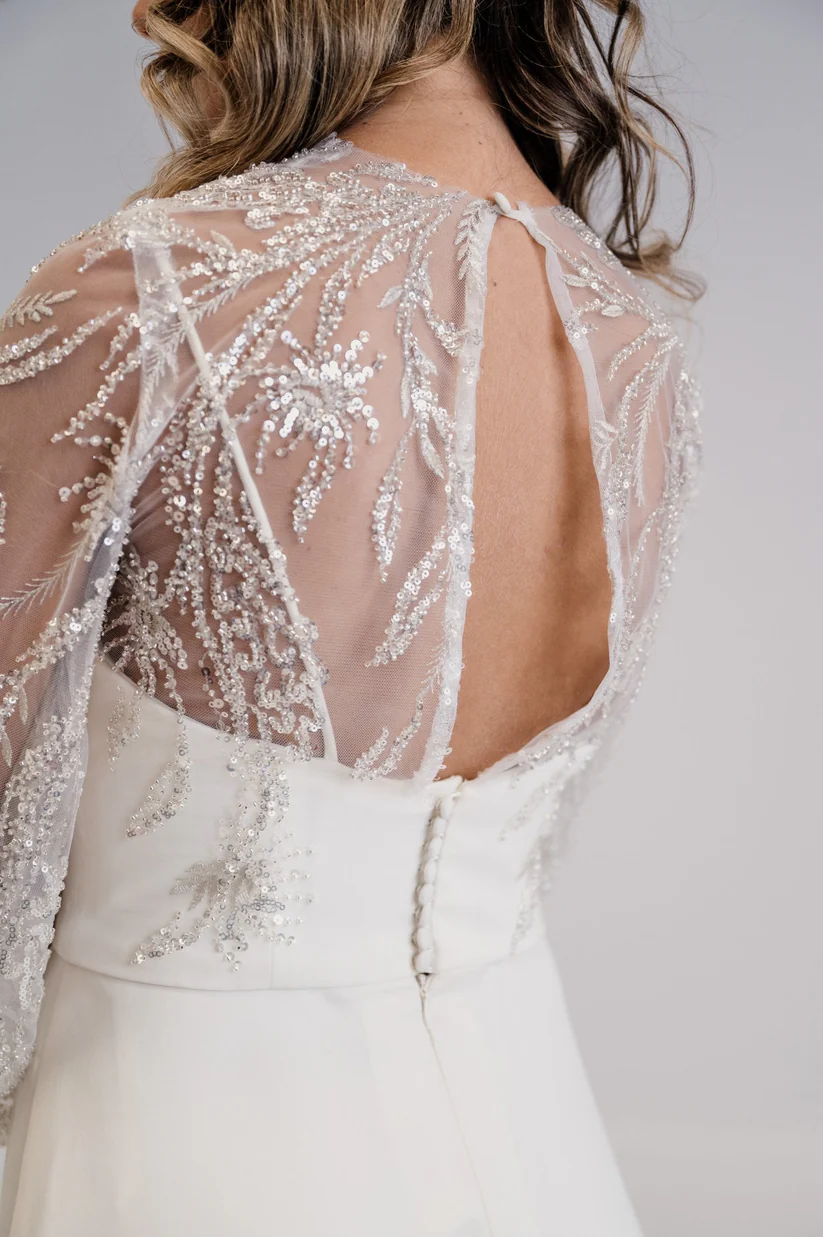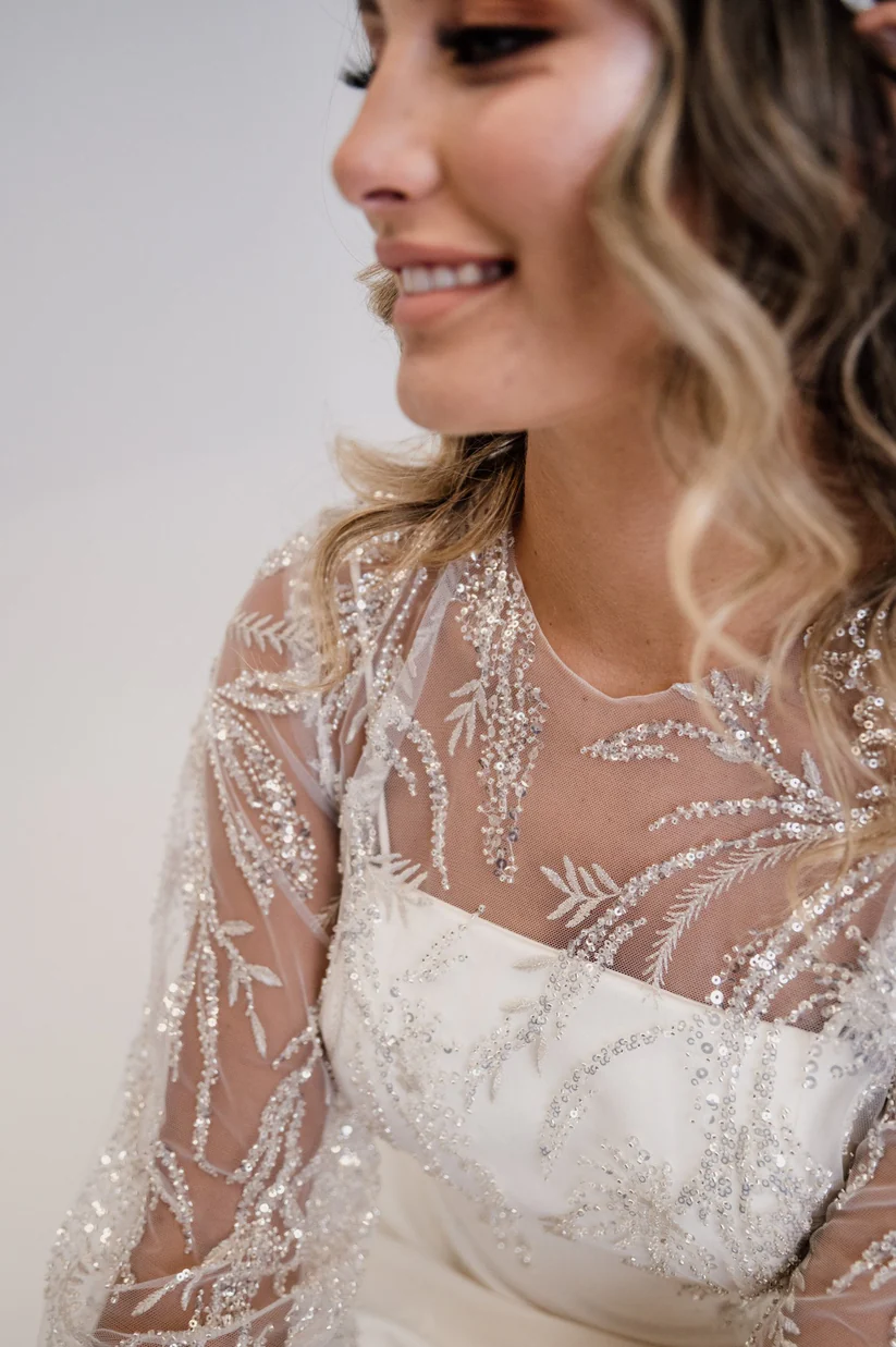If you love modern elegance, Florence will make you blossom on your dream wedding day, with her romantic flair and timeless design. She oozes elegance and sophistication with her over beaded top and bell sleeves, and the high split on the leg adds a little allure. When you walk down the isle, the dress gracefully showcases every step, enhanced with a moderate train that will leave lasting impressions. This dress is perfect for the bride who seeks a style of elegance and boldness.