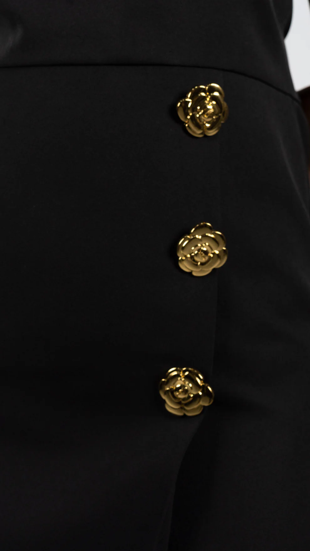 The standout detail? A front thigh-high slit accented by two bold gold buttons at the waist—bringing that edge of opulence to an otherwise minimal design. Clean lines, a high neckline, and a sharply tailored finish make this the ultimate go-to for your next after-hours takeover or elevated workwear moment.