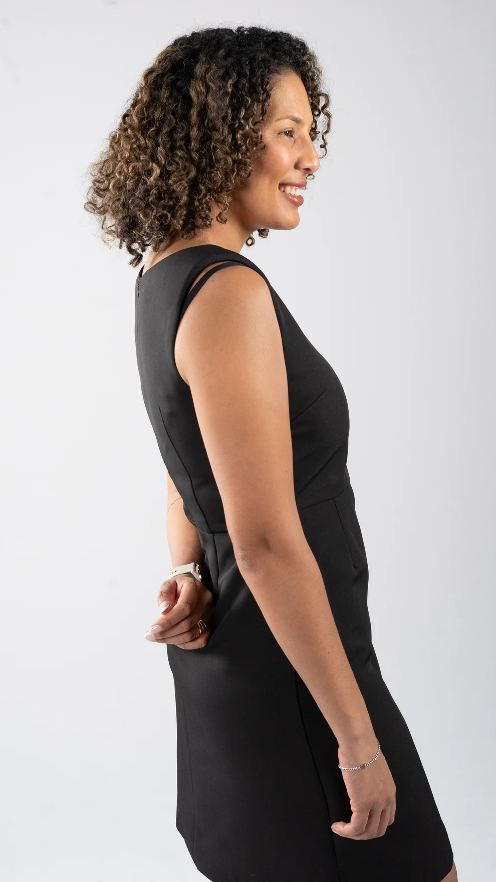 Set the bar high with the Gold Standard Dress—a powerfully sleek mini made for women who lead with confidence. This sleeveless, sculpted silhouette is crafted in a structured black fabric that hugs in all the right places, giving off a refined yet commanding energy.