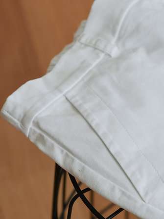 - Our patternmaking and wear testing period identified a small shrinkage of ‘Kim’, 1-2cm – we recommend washing and wearing to best determine length before having any alterations done. We also noticed the ‘Beige’ coloured Kim will become whiter after washing, the mill applied fabric coating washes off. This treatment is to support the cord weave and velvety hand feel.
