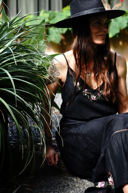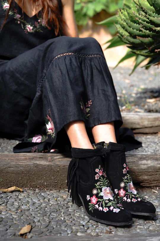 The gorgeous black linen/cotton mix fabric has stunning embroidery of pale pink and mauve flowers with green leaves.