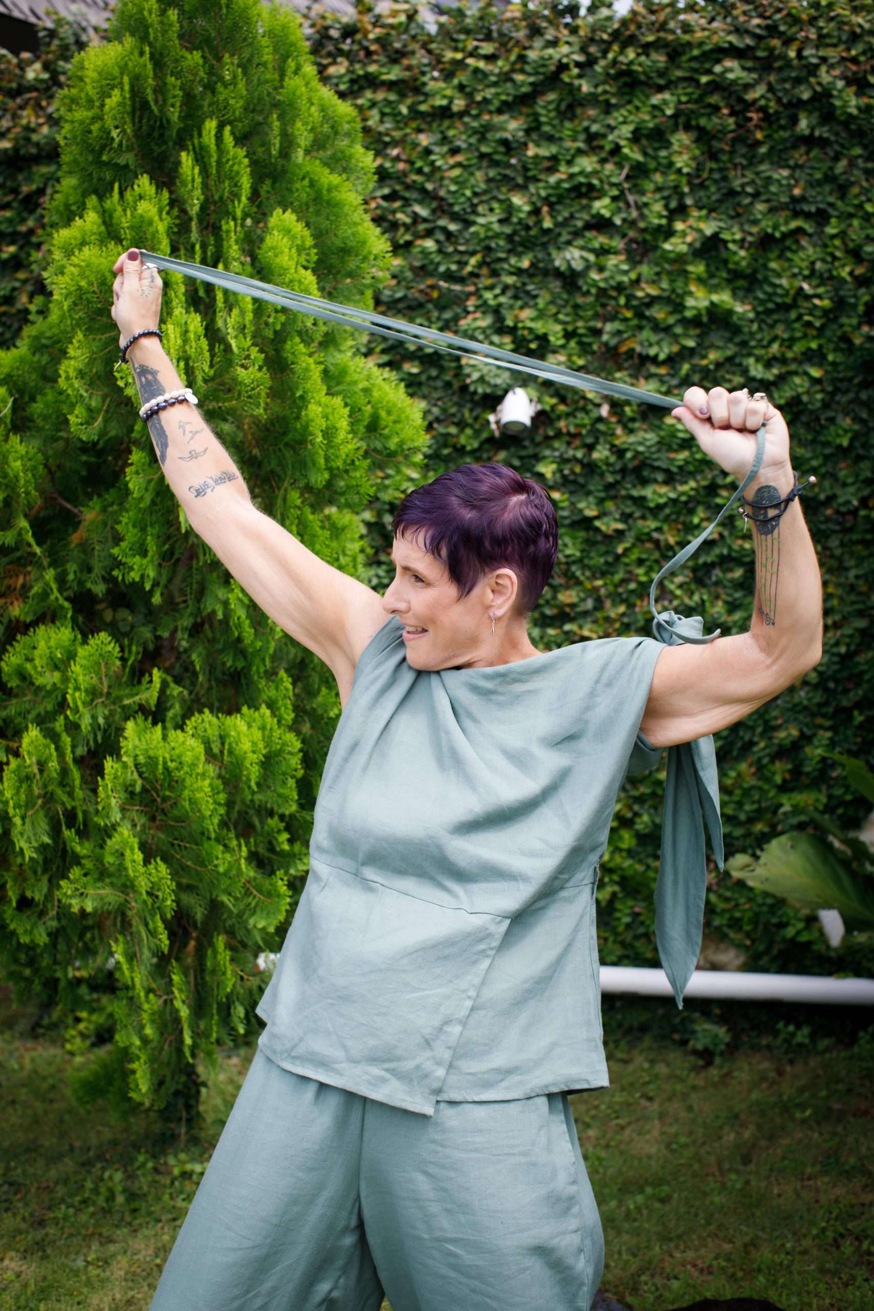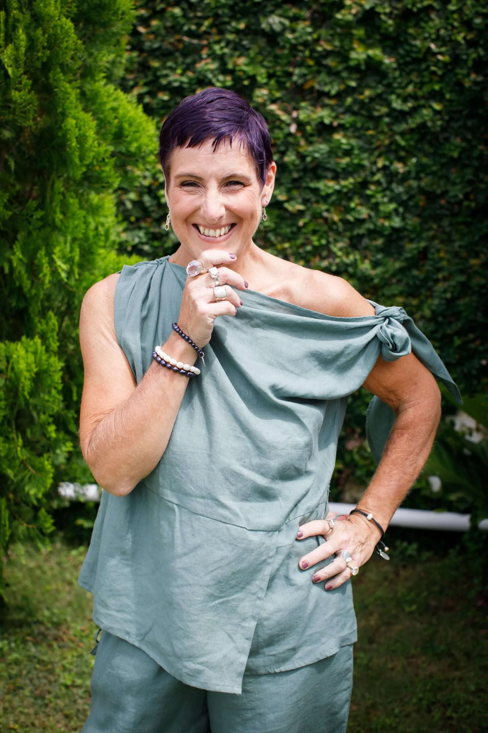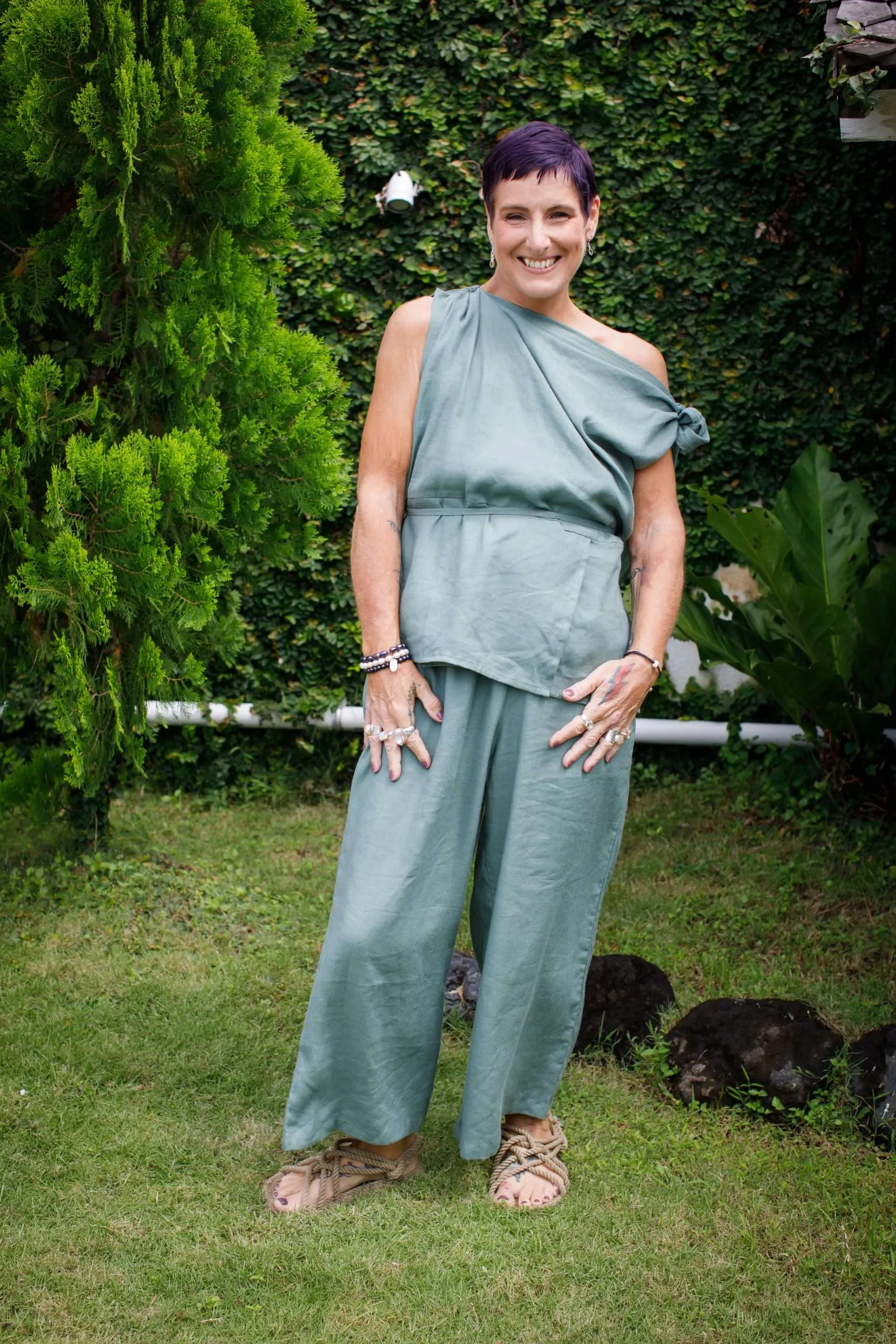 Once again blown away by your wonderful clothes, green pants, and off shoulders top, so many compliments. Everywhere I go I shout your praises. Thanks for the gift of my hair band love it too. Love being a hippie with style and pazaz. !!!!!