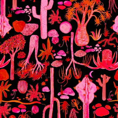 A striking vista of red, pink and orange desert cacti and succulents on a black background. The vibrancy of this print makes it one of the Strebor favourites!