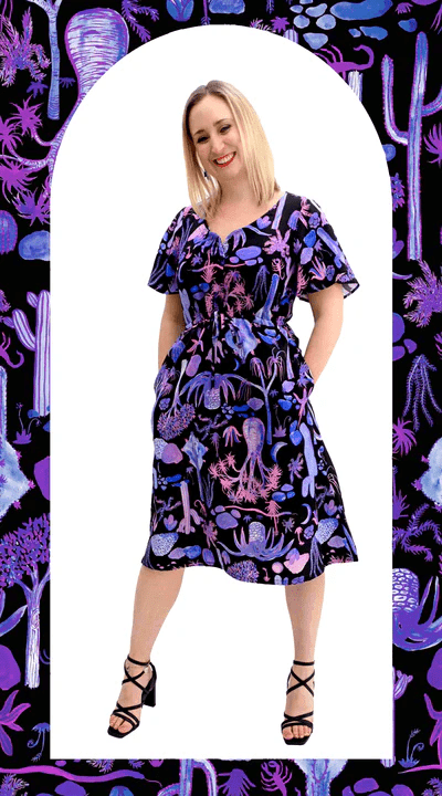 A flattering vista of purple, blue and soft pink cacti and succulents on a black background. This vibrant Violet Palm Springs print dress lends itself to be both casual, dressy and everything in between. You will nail the effortless chic look in one easy step.