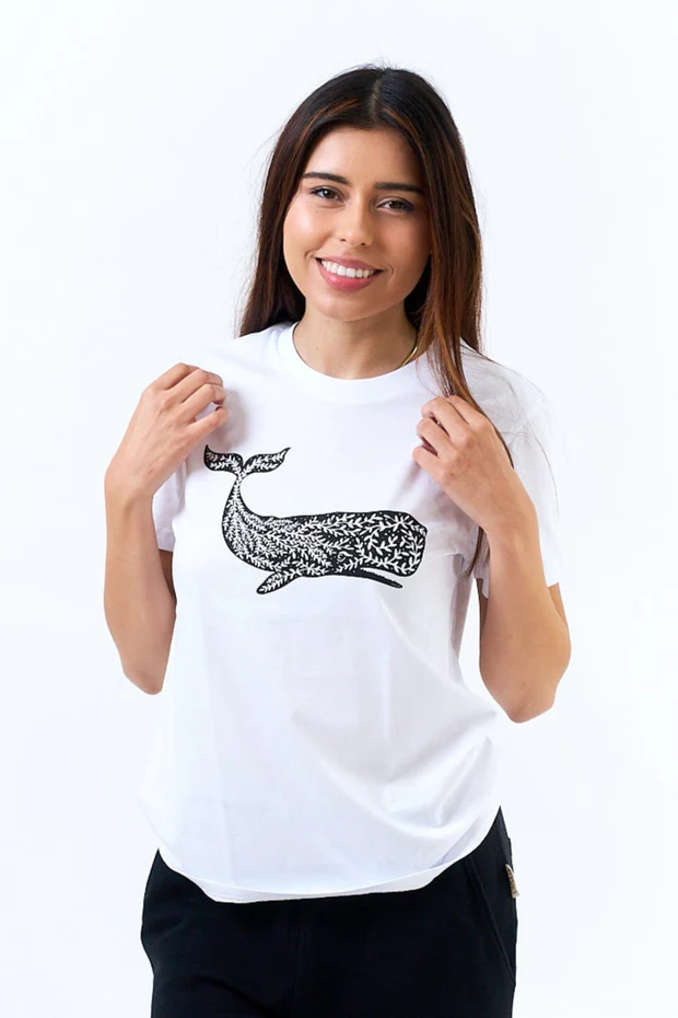 This artwork is printed in water-based ink on our James tee in Natural and White.